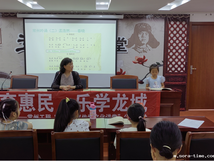 活动特邀“常州吟诵”传习所张翔、吴文娟、盛杨三位老师作为培训主讲。三位教师在培训课上,向参加活动的社区中小学生们充分展示了“常州吟诵”特有的古典诗词读书法,中小学生们饶有兴致地跟着培训老师用常州方言大声吟诵《静夜思》《春晓》等脍炙人口的诗词,充分感受古典诗词的音韵美、节奏美和音乐美。在培训最后展示环节,学生们主动走上讲台展示自我,陪同学生们参加活动的不少社区居民也深受吸引,纷纷参与一起吟诵。