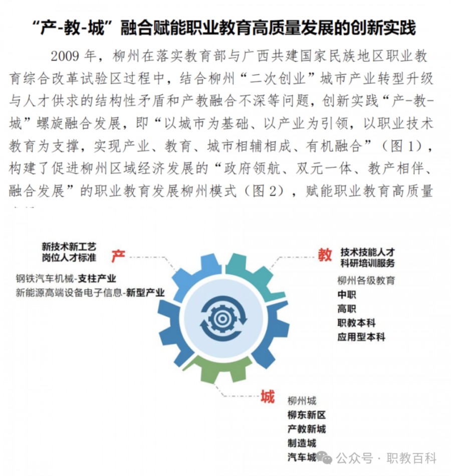 2009年以来,柳州市在落实教育部与广西共建国家民族地区职业教育综合改革试验区过程中,结合柳州“二次创业”城市产业转型升级与人才供求的结构性矛盾和产教融合不深等问题,创新实践“产-教-城”螺旋融合发展理论,即“以城市为基础、以产业为引领,以职业教育为支撑,实现产业、教育、城市相辅相成、有机融合”,创建了“政府领航、双元一体、教产相伴、融合发展”的职教发展柳州模式,赋能职业教育高质量发展。
