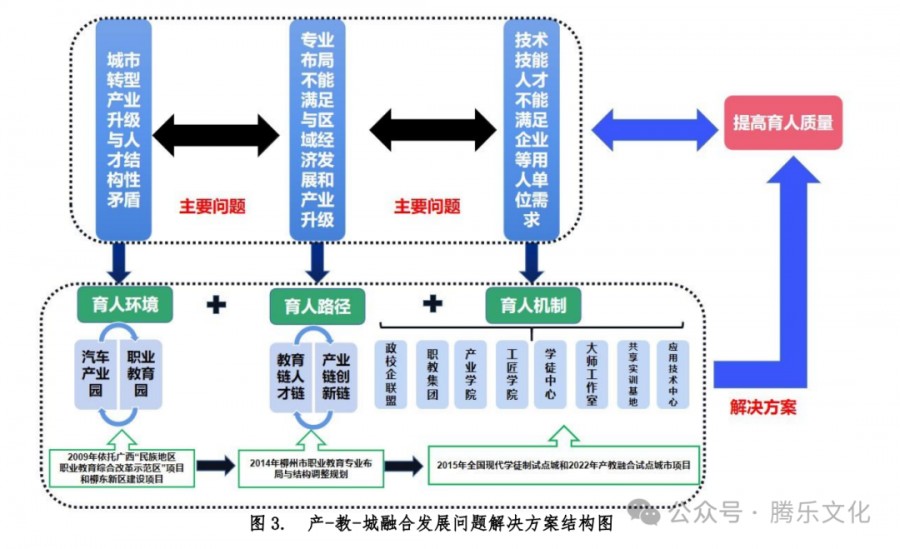 为解决上述问题,柳州市在落实《广西壮族自治区人民政府教育部共建国家民族地区职业教育综合改革试验区协议》以及与广西教育厅共建“民族地区职业教育综合改革示范区”的背景下,在柳东新区同步规划建设汽车产业园与职业教育园,创设“校企一体、双园一体”的双元育人环境;2014 年进行专业布局与结构调整,建设“产业-专业”集群,构建产教平台,创新协同育人机制,提高技术技能人才培养质量。
