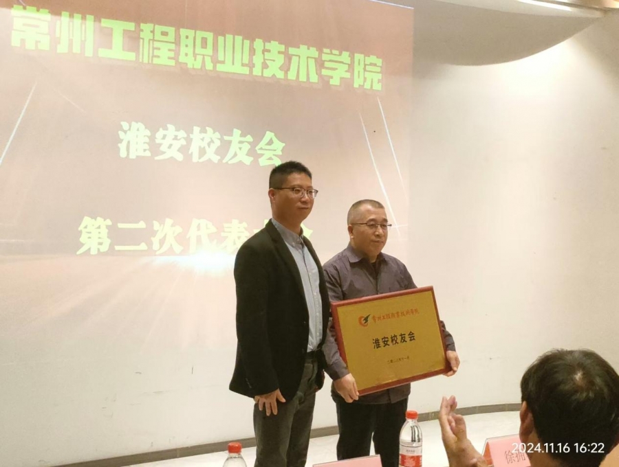 会上,第一届淮安校友会会长朱明、秘书长朱珠对第一届淮安校友工作展开了全面且深入细致的回顾与总结。他们的发言犹如一部部生动的纪录片,将过往校友工作的点滴一一呈现,让在场的每一位校友都重温了那些温暖而难忘的岁月。总会秘书长徐拥军宣读了校友总会的批复。紧接着,检测学院党总支书记蒋文嵘与新任会长朱成军共同完成了庄重的授牌仪式,当崭新的牌匾被高高举起,这不仅象征着淮安校友会新征程的盛大开启,更承载着无数校友对未来的殷切期望。新任会长朱成军在发言中,满怀着激情与憧憬,对未来淮安校友会工作进行了清晰而富有建设性的展望与规划。他表示,未来淮安校友会将积极搭建多元化的校友交流平台,定期举办各类行业研讨会、经验分享会和校友企业互访活动。96硅酸盐班校友万德春、生物1211班校友杨韬代表淮安校友分别发言。